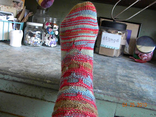 I have been knitting. Made some more of those baby bell bottom pants, but can't find the pictures. Made them in a pretty chocolate brown with a cute little pink onesie. Made a nice little gift. Our church seems to be a baby factory!! I'm sure not drinking the water!! :) I finally finished my Circle Socks. Last August, DH and I went to Wisconsin and found a beautiful yarn shop in an old bank. I found some Ty Dy Sock yarn by Knit 1 Crochet Two, in the color mineral. I love it!! Wanted to do Jaywalkers, but I think this yarn was too splitty so I saw these Circle Socks on Ravelry and thought that would work better. I do like this pattern, and modified the instep with a diamond decrease. Not original idea, Lilia on Ravelry came up with it and it works out beautifully!! Thanks Lilia!! I also modified the toe, not sure what you call it, but you end with the kitchner stitch, which I love. The original pattern calls for the Star Toe, which I do not love. So, I am all in all very happy with these.